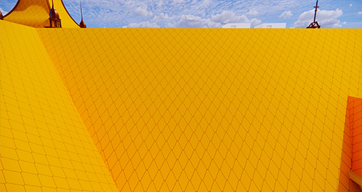 此為惱包奧萊水世界項目,此屋面系統采用的是新型建筑材料金屬復合瓦鋪設...